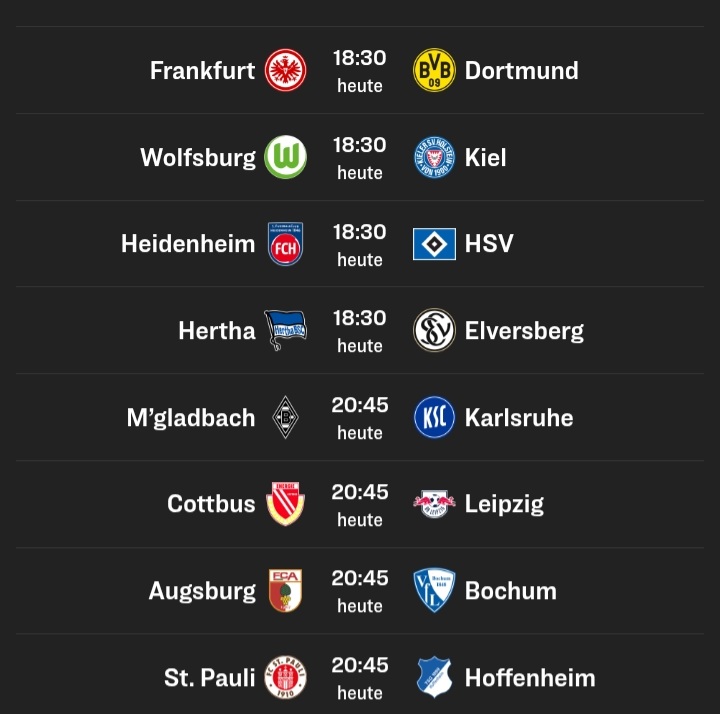 >>151620662>Heidenheim - HSVHSV>Hertha - ElversbergBSC>Frankfurt - Dortmund (ZDF)CHADMUND>Wolfsburg - KielHOLZBEIN>Cottbus - LeipzigBVLLZ>M'Gladbach - KarlsruheKSC>Augsburg - BochumWAF>St. Pauli - HoffenheimHOFFENHEIM>Illertissen - MagdeburgILLERTISSEN>Fürth - K'lauternFCK>Paderborn - LeverkusenB00>Mainz - StuttgartVFB>Union - BielefeldHUHNION>Darmstadt - SchalkeDARMCHUDS>Düsseldorf - FreiburgFREIBURG>Köln - Bayern (ARD)EFFZEH