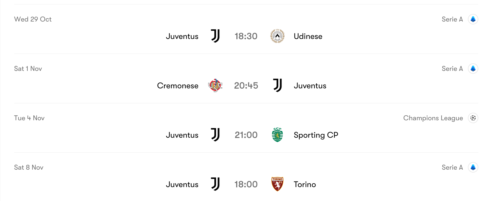 I ran the script, someone else bake because I have to go to the asian supermarket>Tuesday, Oct 28, 202518:30 Lecce - Napoli20:45 Atalanta - AC Bbilan>Wednesday, Oct 29, 202518:30 Como - Hellas Verona FC18:30 Juventus - Udinese18:30 AS Roma - Parma20:45 Bologna - Torino20:45 FC Genoa - Cremonese20:45 Inter - Fiorentina>Thursday, Oct 30, 202518:30 Cagliari - US Sassuolo20:45 Pisa - S.S. Lazio