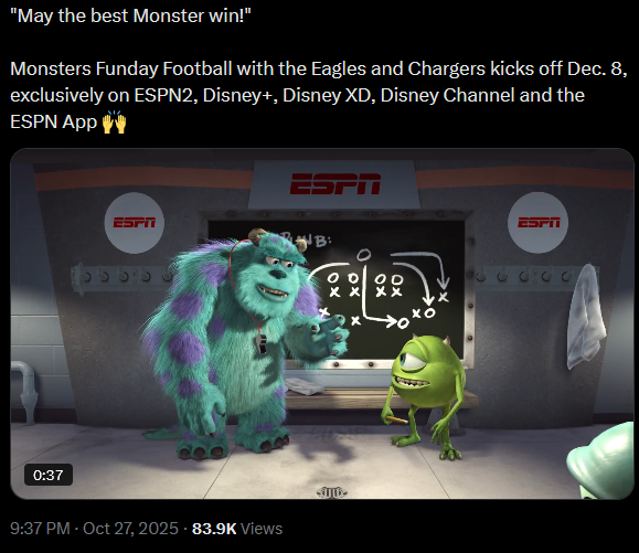 >>151658817> What was the announcement???? I was taking a dumpWell you're in for a treat.Join us for Monsters Funday Football with the Eagles and Chargers kicks off Dec. 8, exclusively on ESPN2, Disney+, Disney XD, Disney Channel and the ESPN App "May the best Monster win!"