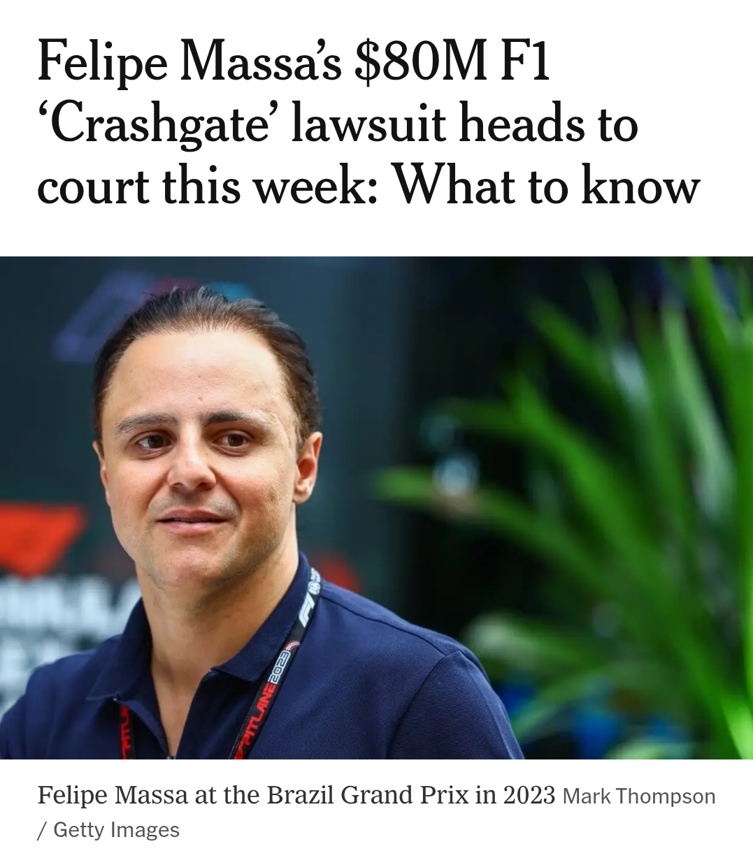 https://www.nytimes.com/athletic/6755583/2025/10/28/felipe-massa-crashgate-f1-lawsuit-hearing/>The biggest case in the history of F1 starts tomorrow.>Preliminary hearings regarding his case against the FIA, Formula One Management, and former F1 CEO Bernie Ecclestone concerning the 2008 title, specifically the ‘Crashgate’ scandal that he claims cost him the championship, will be held in a London high court this week, a year after his lawsuit was filed