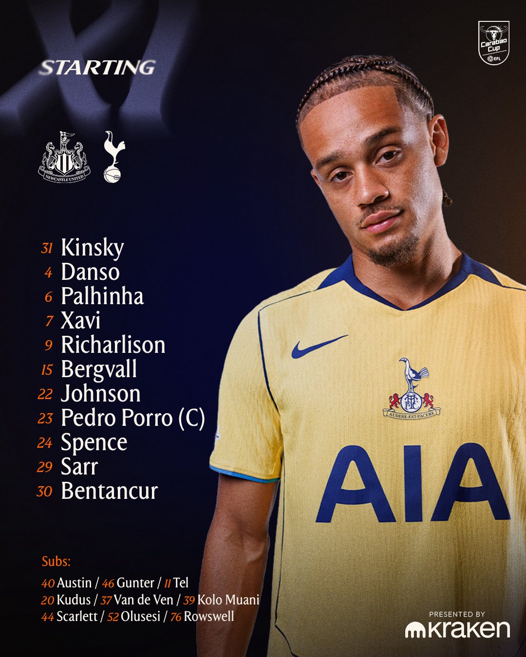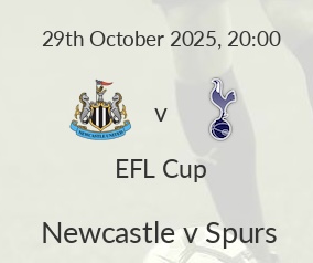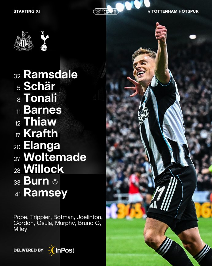 Kickoff in 25 bingsNewcastle: Ramsdale, Krafth, Thiaw, Schar, Burn, Willock, Tonali, Ramsey, Elanga, Woltemade, Barnes.Subs: Pope, Trippier, Botman, Joelinton, Gordon, Osula, Jacob Murphy, Guimaraes, Miley.Tottenham Hotspur: Kinsky, Porro, Danso, Sarr, Spence, Bentancur, Joao Palhinha, Johnson, Bergvall, Simons, Richarlison.Subs: Austin, Tel, Kudus, van de Ven, Muani, Scarlett, Olusesi, Rowswell, Gunter.