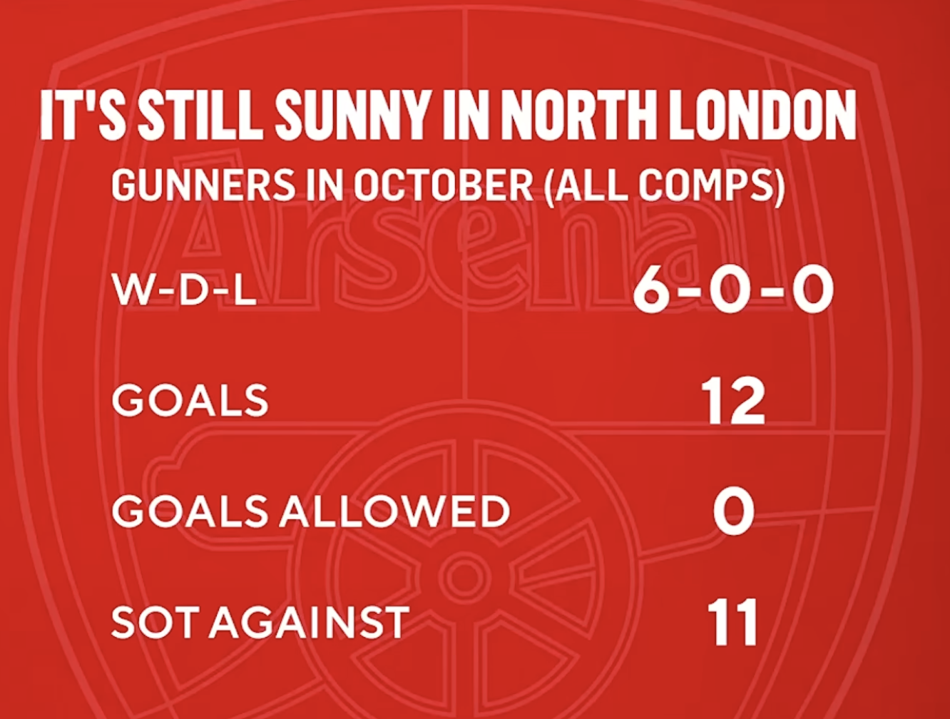 5 games played in October. 5 wins, 0 defeats. 12 goals scored, 0 goals conceded.