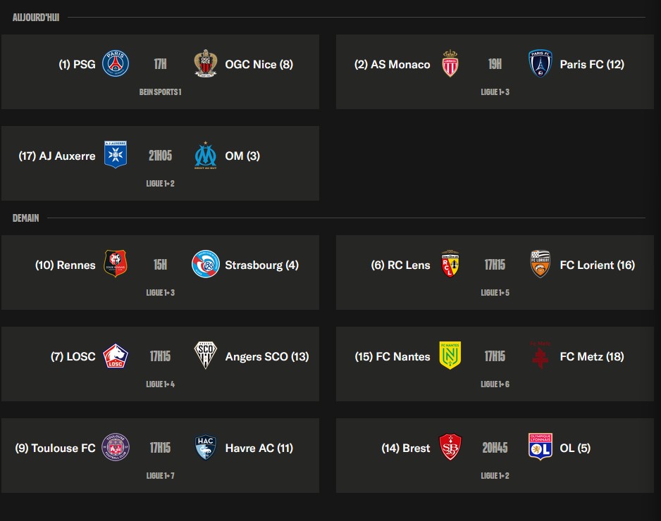 Saturday 01/115pm CETPSG - OGC Nice7.pm CETMonaco - Paris FC9.05pm CETAuxerre - OMSunday 02/113.pm CETRennes - Strasbourg5.15pm CETLens - LorientLOSC - AngersNantes - MetzToulouse - Le HavreMAIN EVENT, 8.45 CETSTADE BRESTOIS 29 - OLYMPIQUE LYONNAISKWAB of the week standings:1. OL (4x KWABs)2. OM (2x KWAB)3. Stade Rennais (1x KWAB)3. FC Lorient (1x KWAB)3. The City of Marseille (1x KWAB)3. Monaco (1x KWAB)