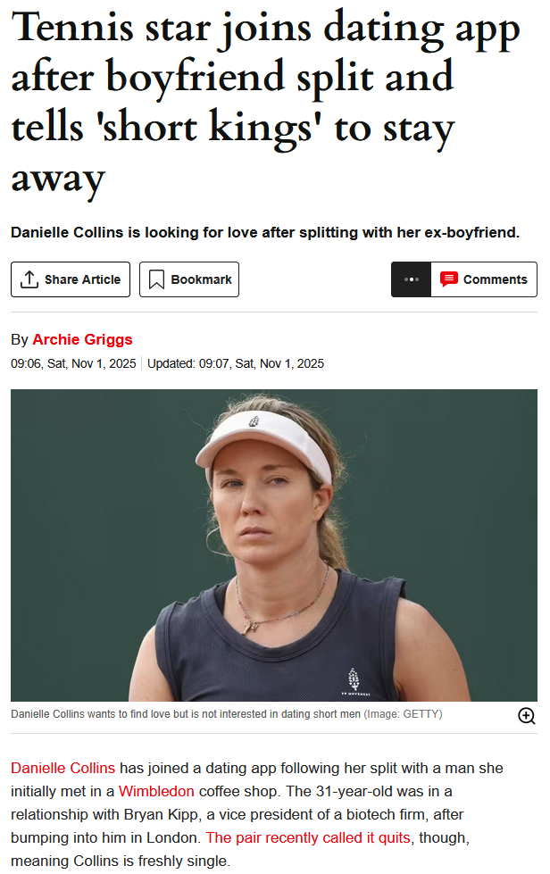 >Danielle Collins has joined a dating app following her split with a man she initially met in a Wimbledon coffee shop. The 31-year-old was in a relationship with Bryan Kipp, a vice president of a biotech firm, after bumping into him in London. The pair recently called it quits, though, meaning Collins is freshly single.>Her bio read: "Currently a professional tennis player, but kind of aspiring to be a trad wife. Straight up. Already had my boss babe era.>"Just wanting to raise my chickens, do home projects, make freshly baked sourdough, be a stay at home dog mom, and hopefully pop out some babies soon. If you’re going to lie about your height just leave me the f*** alone. This is a no short kings zone."