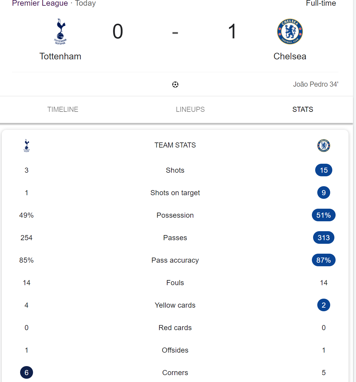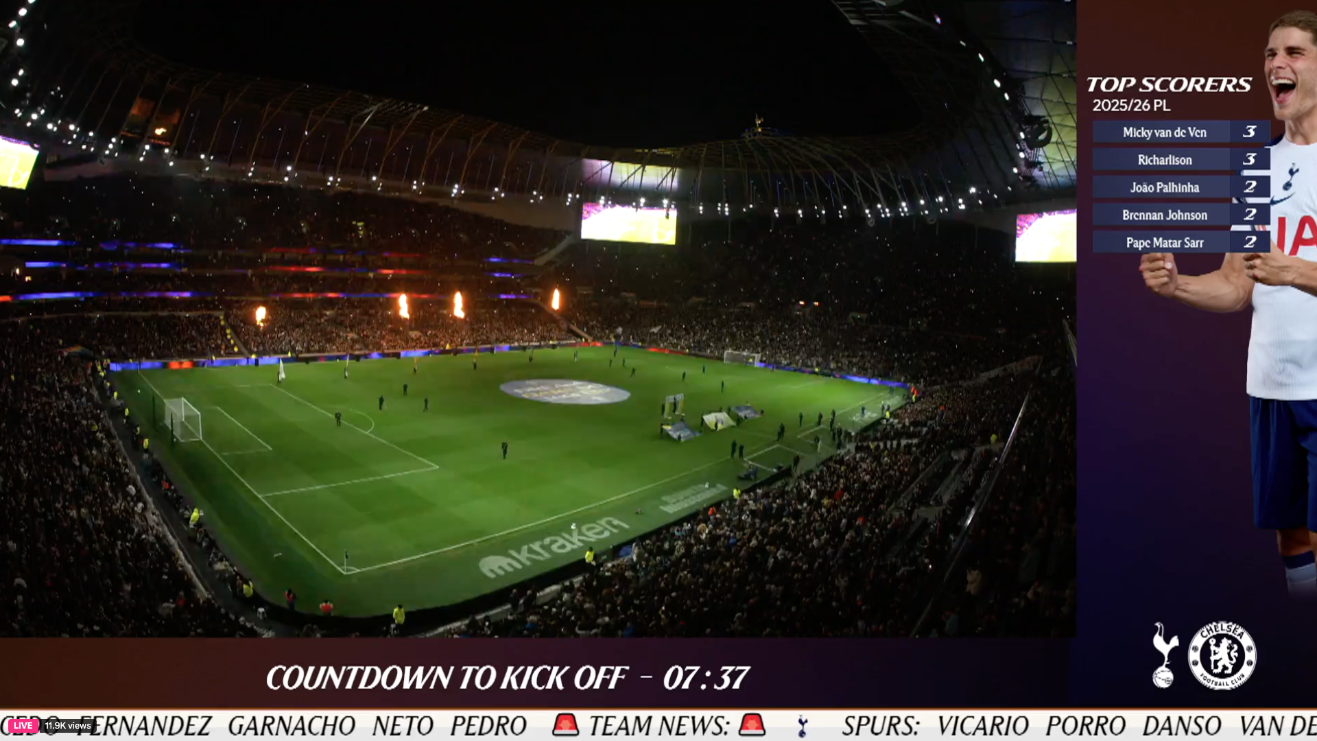 KO 5:30PM UKSPURS: Vicario; Porro, Danso, van de Ven (c), Spence; Palhinha, Sarr, Bentancur; Bergvall, Kudus; Kolo Muani.>SUBS: Kinsky, Simons, Richarlison, Tel, Udogie, Romero, Johnson, Odobert, Scarlett.CHELSEA: Sanchez; Gusto, Fofana, Chalobah, Cucurella; James (c), Caicedo; Neto, Fernandez, Garnacho; Pedro.SUBS: Jorgensen, Adarabioyo, Acheampong, Hato, Lavia, Santos, Estevao, Gittens, Guiu.