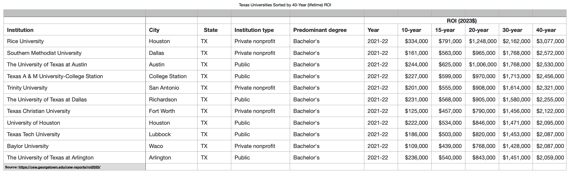 >>151747254A big part of it is networking opportunities, which is why Rice (rich Houston people), SMU (rich Dallas people), and Trinity (rich central Texas people) are so high on the list