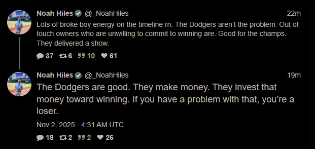 This Dodgers dynasty is very reminiscent of the Warriors from like 10 years ago. Everyone seethes at them and says they're evil but no one can actually articulate a reason why other than >t-they're too good and try too hard to win