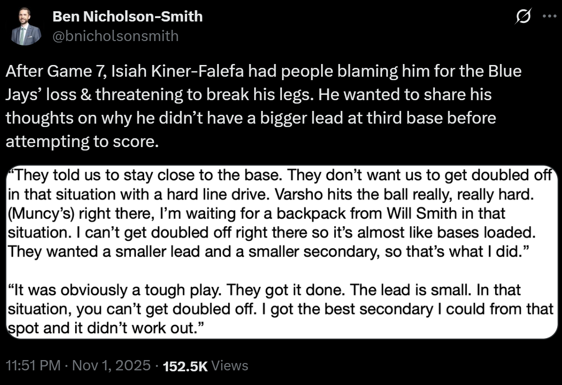 no doubt - anyone with eyes can agree to that he Yamamoto fully deserves MVP and i’m super happy for him. it’s just that some people on this board would have you believe Ohtani was awful or invisible this series and that’s empirically untrue. and i know a bunch of assmad haters want to point to his pitching and they’d have a point if he was only a pitcher but he’s not.