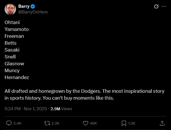 It was the single greatest world series I have ever watched in my life. You couldn't script a more tense, edge of your seat, nail biting game seven with so many stories and narratives woven into the background. My son called me this morning and we just spent an hour talking about that game. I wish my grandson was a couple of years older so that he would have memories. It was the kinda game you only see once in your life and the reason you are willing to put up with years of disappointment and some genuinely dogshit games.