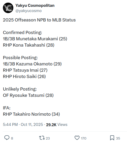 Him? Gotta be honest I’m not up on NPB players I just copied the FA list from mlb.com