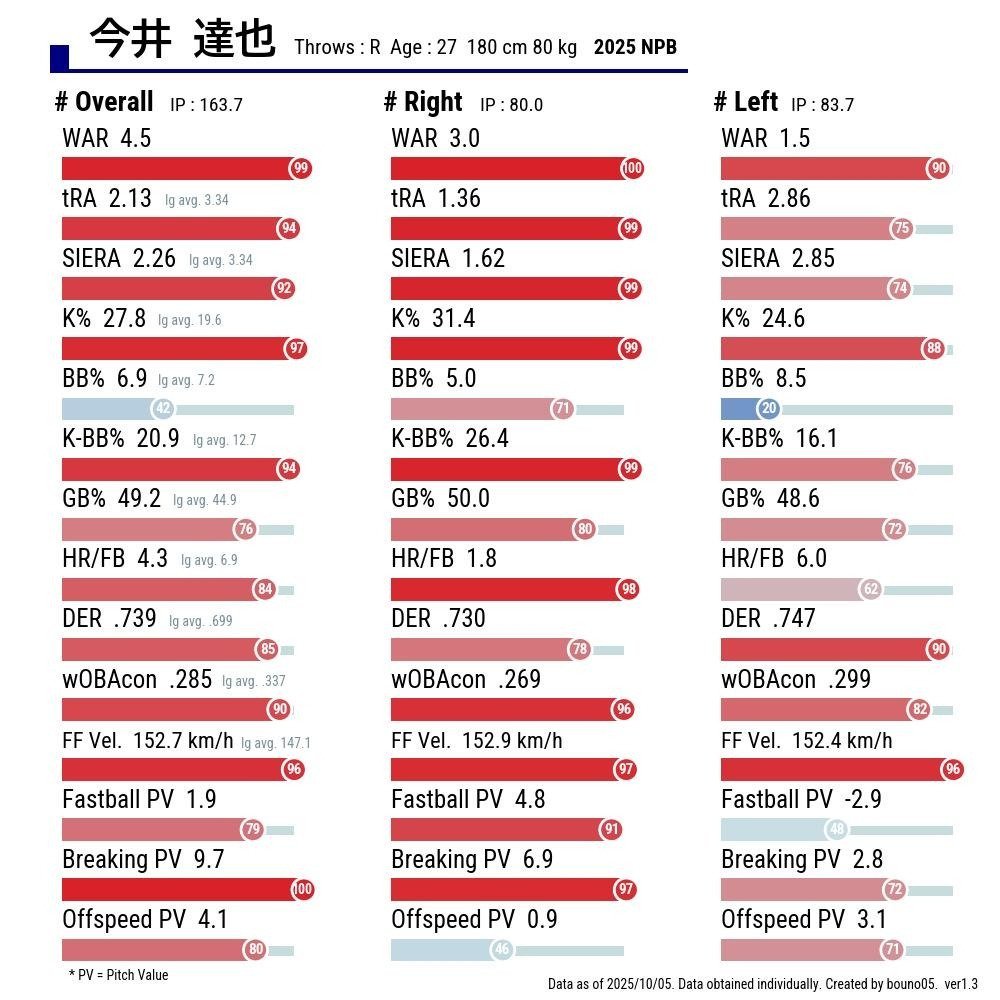 It's Imai, he just closed out his breakout season posting a career-high 27.8% strikeout rate (NPB average: 19.6% strikeout rate) across 163.7 IP. For reference, Yoshinobu Yamamoto recorded a 26.6% strikeout rate in his final NPB season (2023) with the Orix Buffaloes. Imai’s strikeout rate has trended positively through eight NPB seasons. He excels at limiting hard contact (16.5% hard hit rate) and preventing pitches from leaving the park (4.3% HR/FB). Imai’s 53.8% ground ball rate.