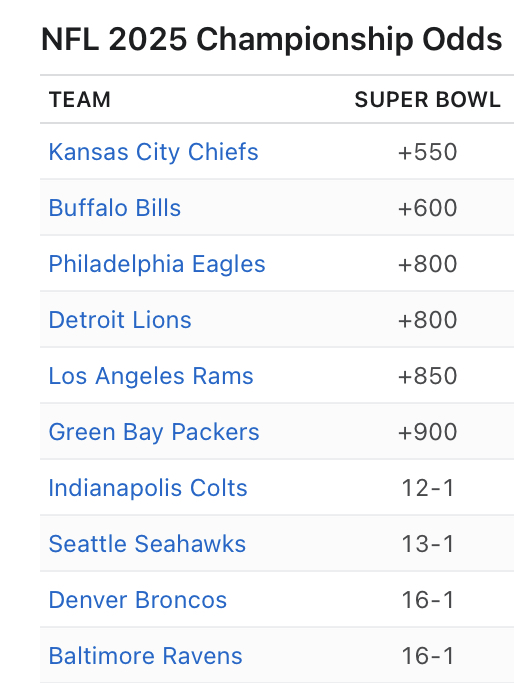 >>151821517There is a real chance they miss the playoffs though. They have to finish with a better record than the Jags (who hold the tiebreaker) and the Jags have a more favorable schedule. The also have to hope Lamar doesn’t win most of the remaining games, especially if the Steelers also win most of their games and tie the Ravens. That’s a lot of ifs that should be factored in these betting odds instead of basing it off previous playoff and sb success, weak conference, Mahomes performance, etc