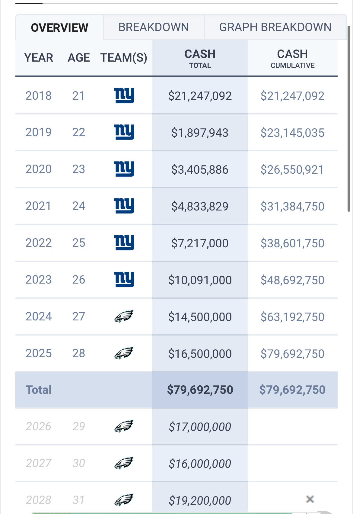 >>151822556Is that even your point? If it is I’ll let you have that and agree to disagree. He turned down a bad offer from the Giants for a good one from the Eagles and you feel betrayed for your own personal emotional reasons. That’s fine. I was moderately confused by the “12 million a year from the eagles” line you said in this post >>151822453 because that’s obviously not true but I guess that was just me being confused by your sloppy writing.