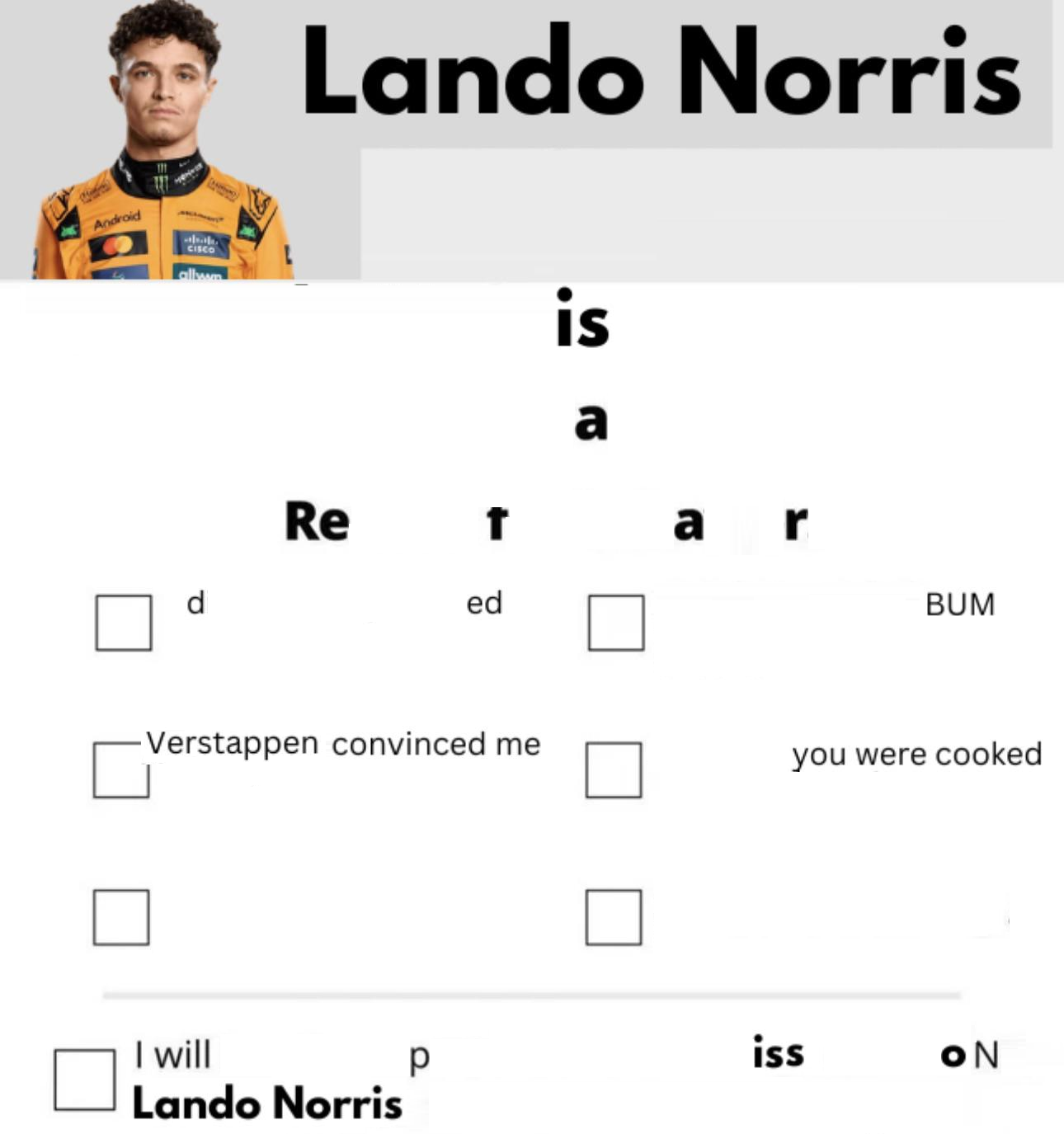I know that Lando is probably going to "win" the wdc, but I'm not going to give up hope that anyone else could win it instead.Even Oscar would be preferable.