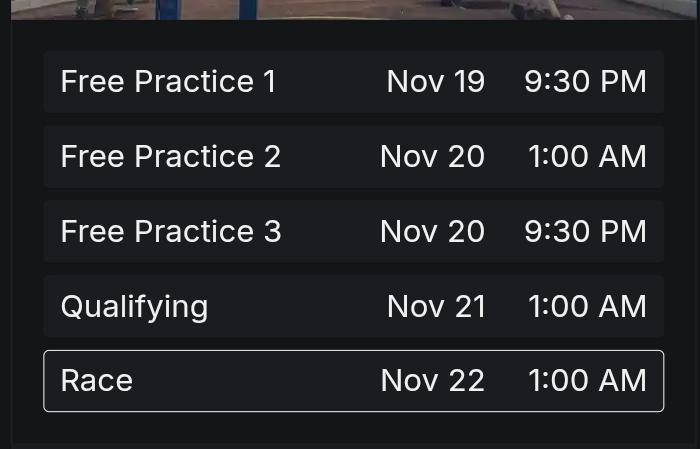 >Lap:#8221>Countdown to Gas Vegas GP:https://f1exposure.com>Previous thread:>>152016567>/f1/ Essentials:https://pastebin.com/tZ67Gcuq>24/7 stream of the F1 Reviews from 1990-2009 (and possibly more F1-related content in the future):https://angelthump.com/gimi>FantasyGP.com /f1/ League Formula Autism:Passcode: 12481641>Lewis Hamilton Grands Prix with Ferrari without scoring a podium:21>Haas F1 Team F1 Grands Prix without ever scoring a podium:211>Fernando Alonso F1 Grands Prix since last win:222 (221 starts)>2025 WDC Standings:NOR: 390 (+25)PIA: 366 (+10)VER: 341 (+15)RUS: 276 (+12)LEC: 214 (+0)>2025 WCC Standings:McLaren Mercedes: 756 (+35)Mercedes: 398 (+30)Red Bull RBPT: 366 (+15)Ferrari: 362 (+0)Williams Mercedes: 111 (+0)>2025 WEC StandingsHAM: 1,297.52 (+84.40)NOR: 1,206.42 (+29.79)TSU: 1,201.24 (+80.14)>News:VCARB unveils holographic F1 livery for Las VegasBest F1 teams will react and develop quickly to 2026 rules, says Mattia Binotto"F1" movie director Joseph Kosinski confirms sequel plot talks with AppleClaire Williams defends McLaren not favouring either Lando Norris or Oscar Piastri "F1" "announces" "Fortnite" "partnership"No new EA F1 game in 2026, 2025 game gets expansionMercedes think they have learned from 2022Limit of 25 laps per set of tyres for Qatar Grand PrixThree women named Ella got signed to McLaren, probably for cooking, cleaning