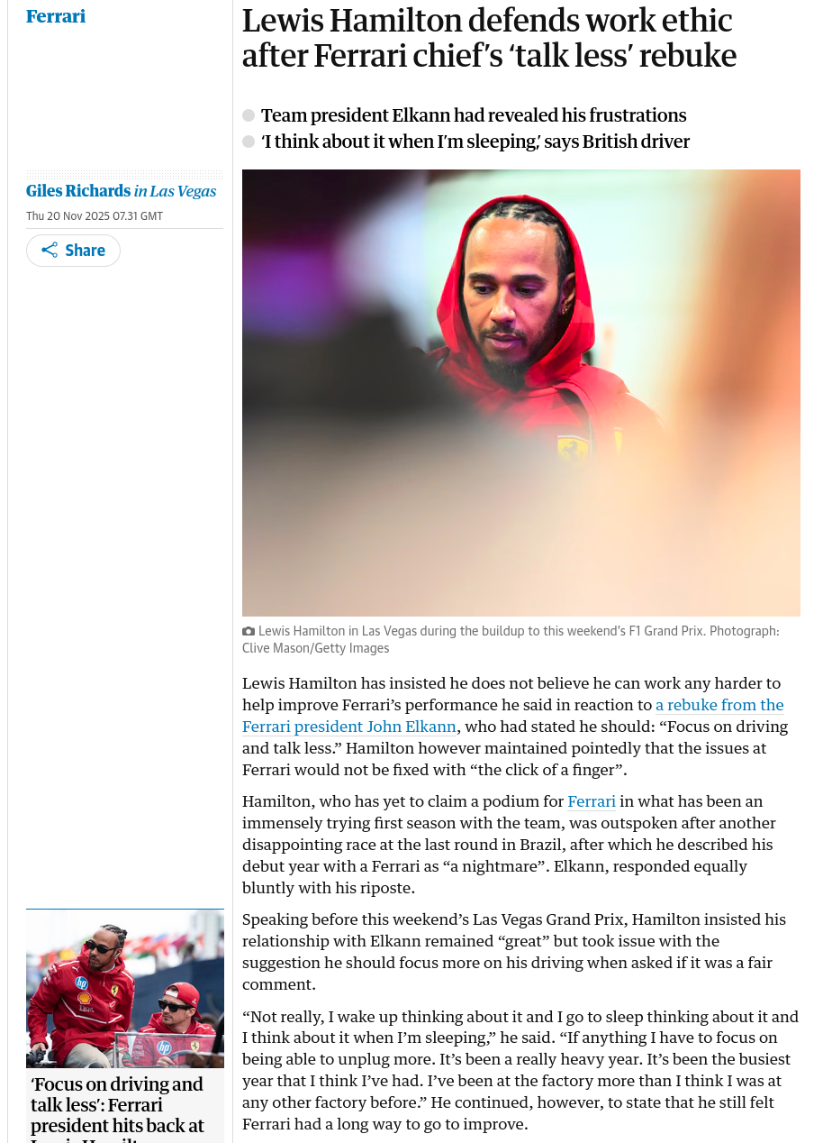 John Elkann BTFOhttps://www.theguardian.com/sport/2025/nov/20/lewis-hamilton-defends-work-ethic-after-ferrari-chiefs-talk-less-rebuke