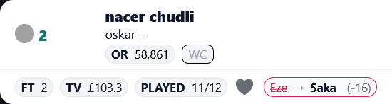 >>152108491Used free hit this week so I brought Saka in. Next week Rice is back in my team.Should've gone with them both instead of the Egyptian fraud
