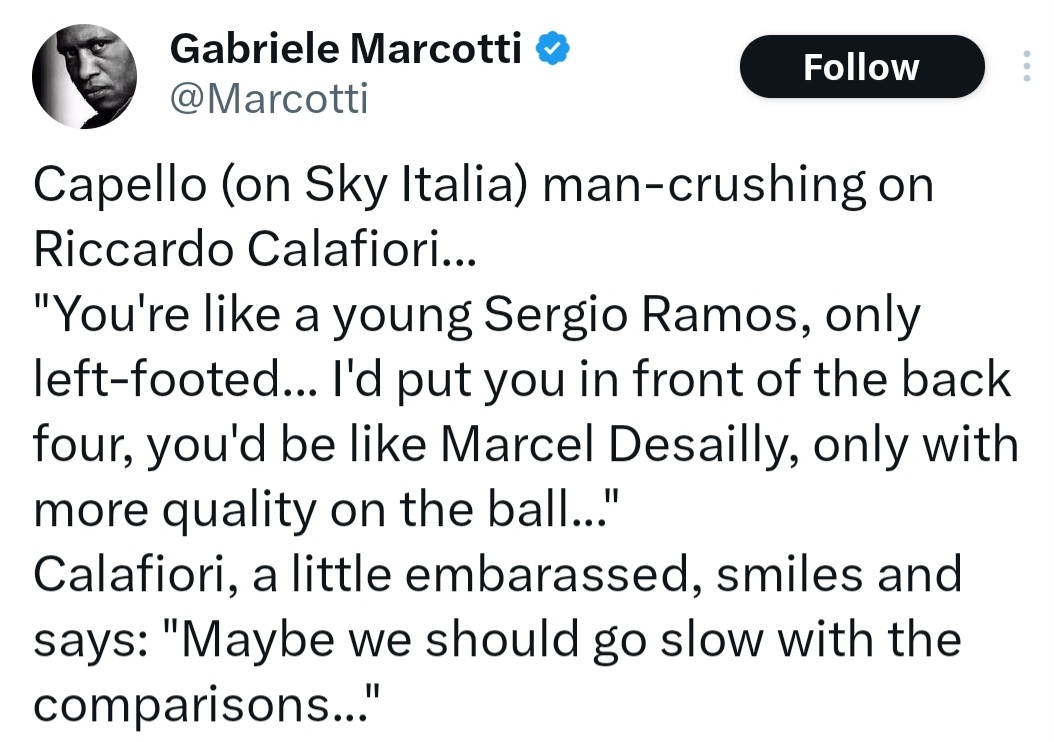 Fabio Capello was in awe of Calafiori and said this yesterday during Sky Italia’s Champions League coverage:“You’re like a young Sergio Ramos, only left-footed.I’d put you in front of the back four, you’d be like Marcel Desailly, only with more quality on the ball.”