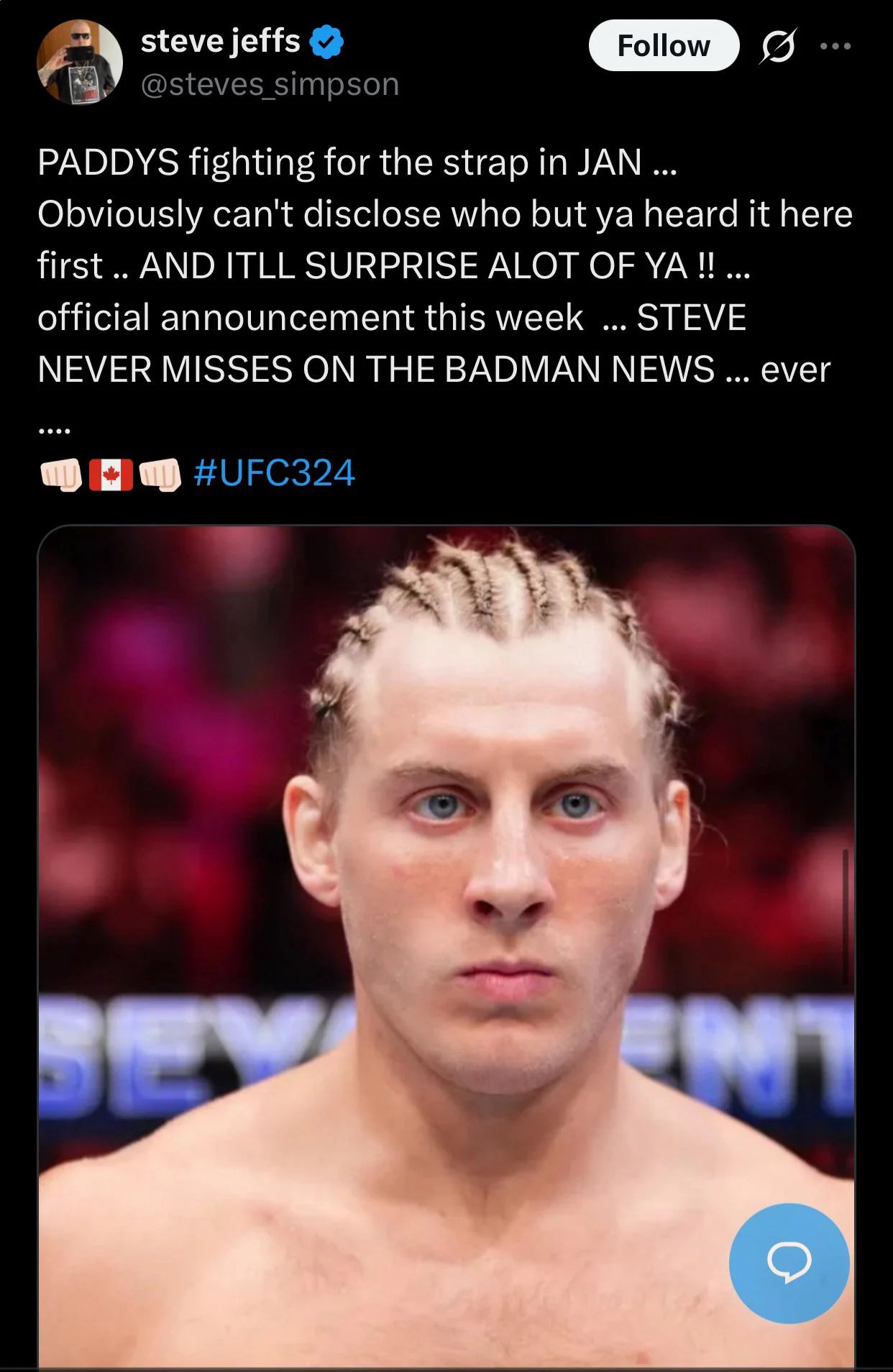 >>152168189he should return with an eye patch. cant shit talk a guy fighting with an eye patch, that was bispings only fumble.