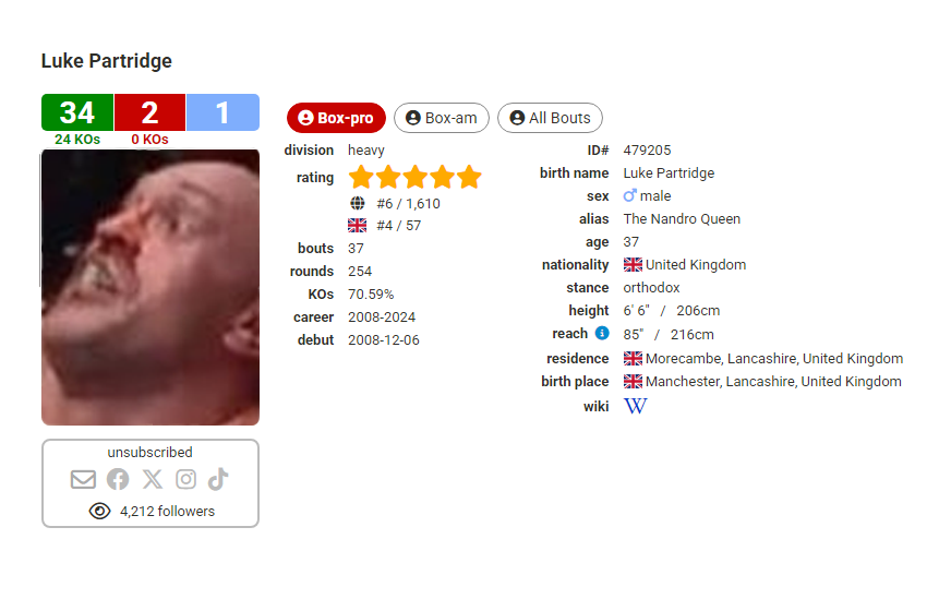 >>152164831Needs to be changed to 4 losses, 6'7.5", and a new stat, retirements 5.However, this faded into obscurity charlatan doesn't have to be used in threads at all, unless he actually comes back to fight AJ. Him talking shit to stay in the spotlight only to not back it up is par for the course.