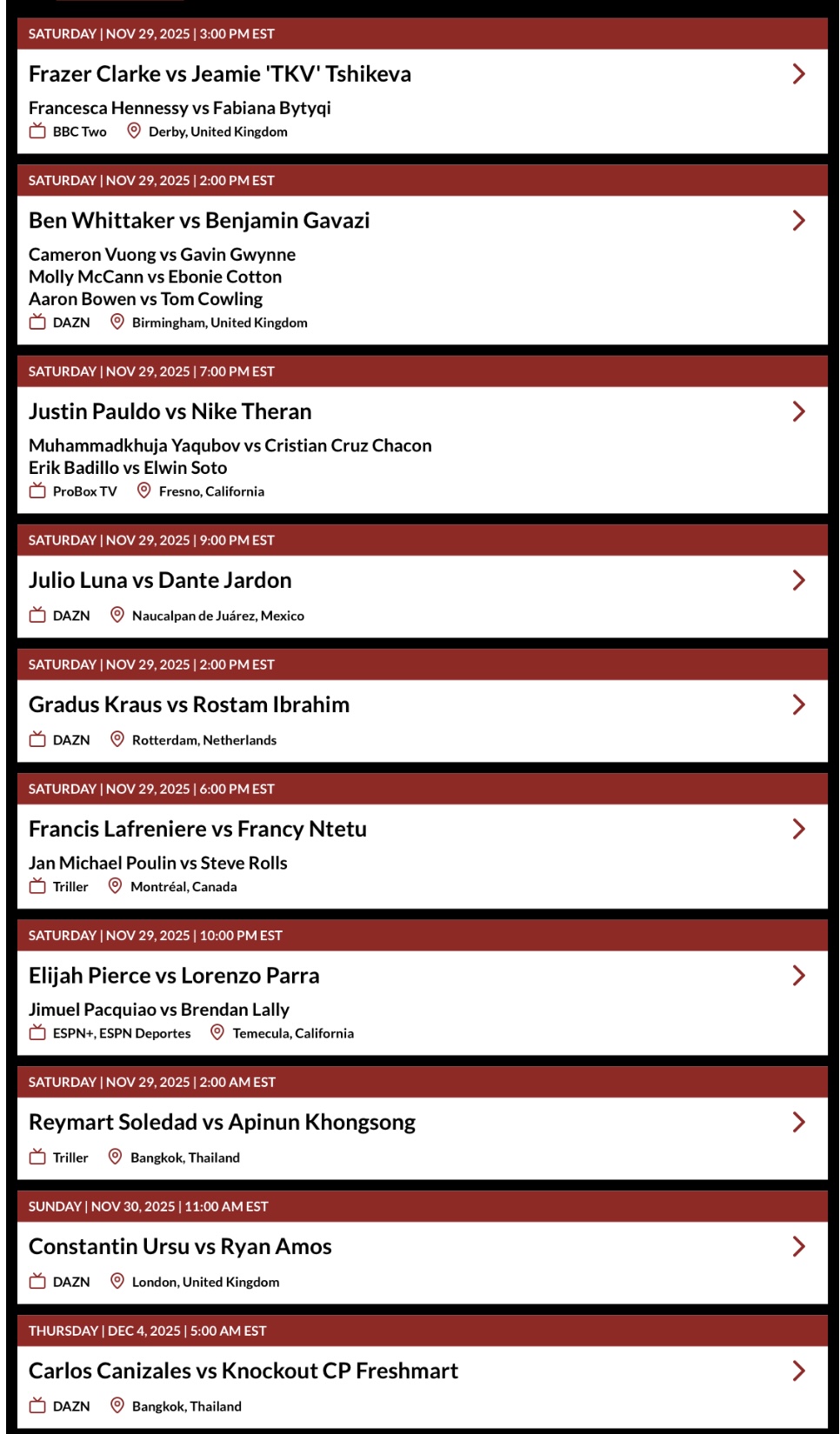 previous >>152099742>December 6thJai Opetaia vs. Huseyin Cinkara>December 6th DAZNShabaz Masoud vs. Peter Mcgrail>December 6th Prime Video PPVIsaac Cruz vs. Lamont RoachErislandy Lara vs. Janibek AlimkhanulyStephen Fulton vs. O'shaquie Foster>December 13th Prime Video PPVBadou Jack vs. Norair Mikaeljan>December 13th DAZNDiego Pacheco vs. Kevin Lele Sadjo
