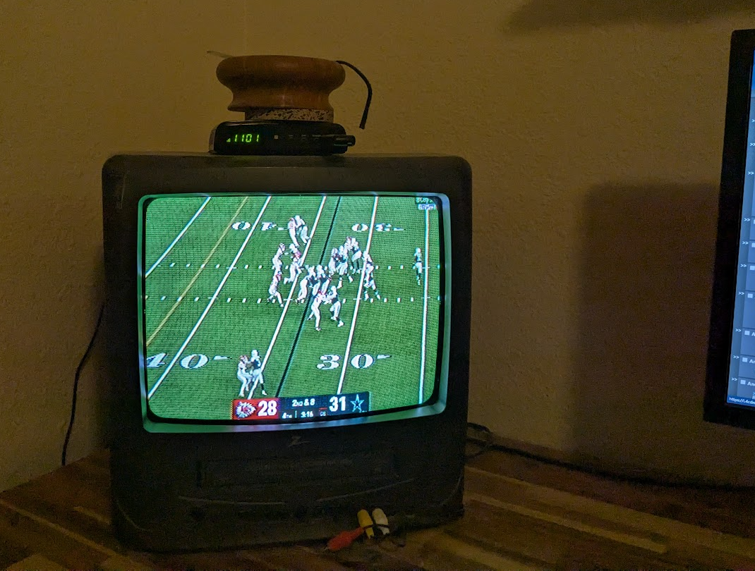 >>152179813The clock is my converter box, also that's the channel the game is on not the time.On top is a coaster and a small wood bowl with some junk inside.