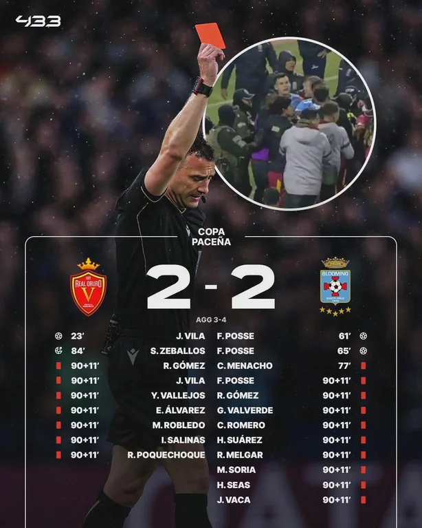 time for an effortpost>Match Details: Real Oruro vs. Blooming in the second leg of Copa Bolivia quarterfinals; Blooming progressed to semifinals despite the draw.>After referee Renán Castillo's final whistle, Blooming's coach Mauricio Soria and players made taunting remarks during celebrations at the locker room entrance, sparking initial scuffles between players and technical staff from both sides.>Fights spread with Argentine players Julio Vila and Sebastián Zeballos (Real Oruro) confronting Blooming's Richet Gómez; separate brawls involved coaching teams, including blows exchanged by Real Oruro's Argentine-Bolivian coach Marcelo Robledo.>17 total red cards>Blooming: Players Gabriel Valverde, Richet Gómez, Franco Posse, César Romero, Héctor Suárez, Roberto Carlos Melgar, César Menacho; coach Mauricio Soria; doctor Henry Seas; physiotherapist José Luis Papu Vaca.>Real Oruro: Players Raúl Gómez, Julio Vila, Yerco Vallejos, Eduardo Álvarez; coach Marcelo Robledo; assistant Iván Salinas Pérez; goalkeepers' coach Rubén Poquecho.>Blooming logistics member Cristian Méndez suffered a maxillofacial fracture requiring surgery; Robledo was hospitalized after altercations. Police used tear gas and pepper spray to break up the melee, affecting players from both teams (no rubber bullets reported).>The Bolivian Football Federation (FBF) is investigating, with potential sanctions including player bans, fines, and closed-door games for Real Oruro.