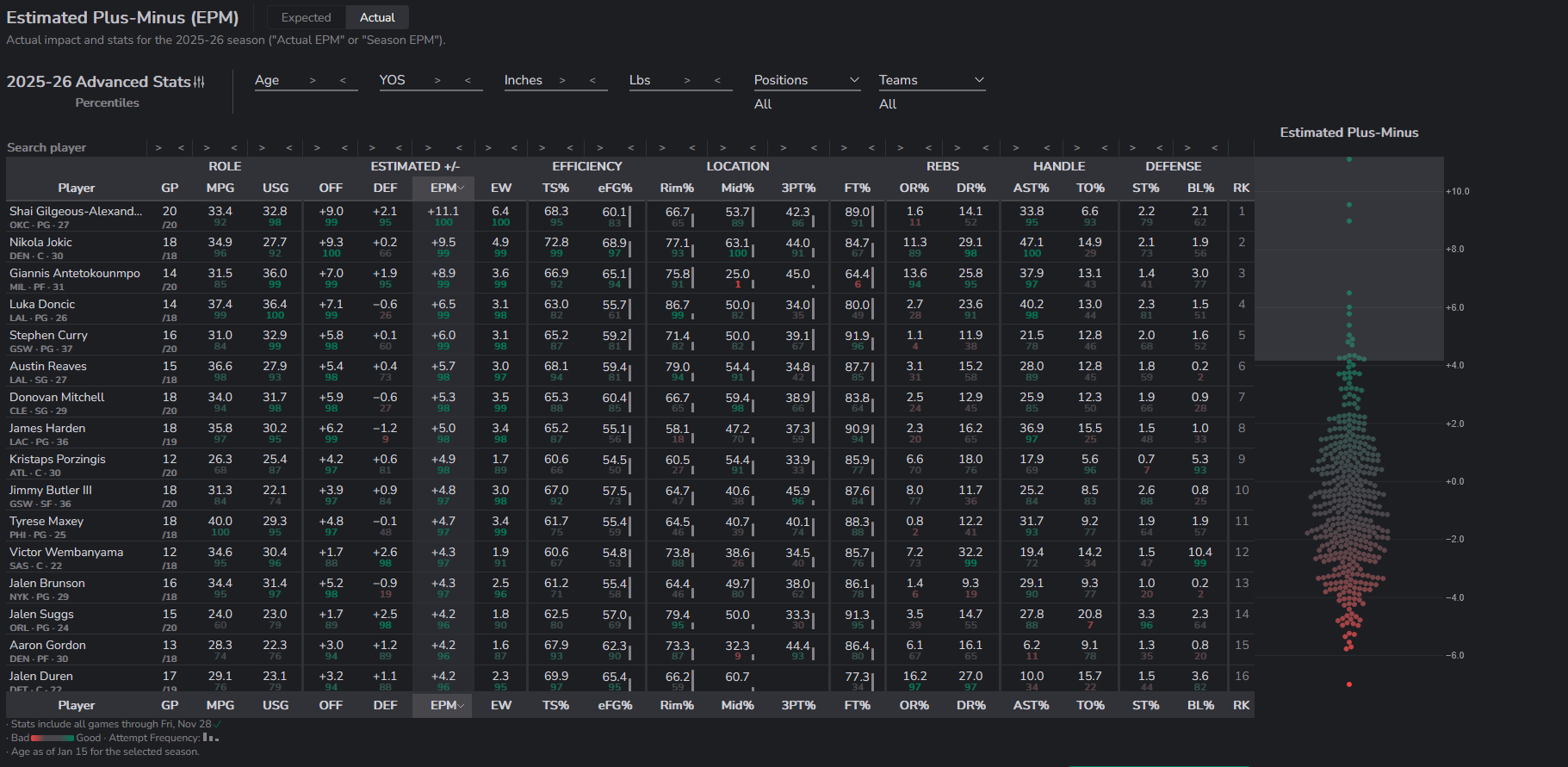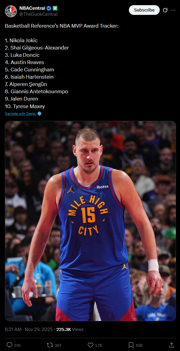 The best player on every team this seasonATL : Jalen JohnsonBKN : Michael Porter Jr.BOS : Jaylen BrownCHA : Miles BridgesCHI : Josh GiddeyCLE : Donovan MitchellDAL : P.J. WashingtonDEN : Nikola JokicDET : Cade CunninghamGSW : Jimmy ButlerHOU : Alperen SengunIND : Pascal SiakamLAC : James HardenLAL : Luka DoncicMEM : Santi AldamaMIA : Tyler HerroMIL : Giannis AntetokounmpoMIN : Anthony EdwardsNOP : Derik QueenNYK : Jalen BrunsonOKC : Shai Gilgeous-AlexanderORL : Desmond BanePHI : Tyrese MaxeyPHX : Devin BookerPOR : Deni AvdijaSAC : Keegan MurraySAS : De'Aaron FoxTOR : Scottie BarnesUTA : Keyonte GeorgeWAS : Alex Sarr