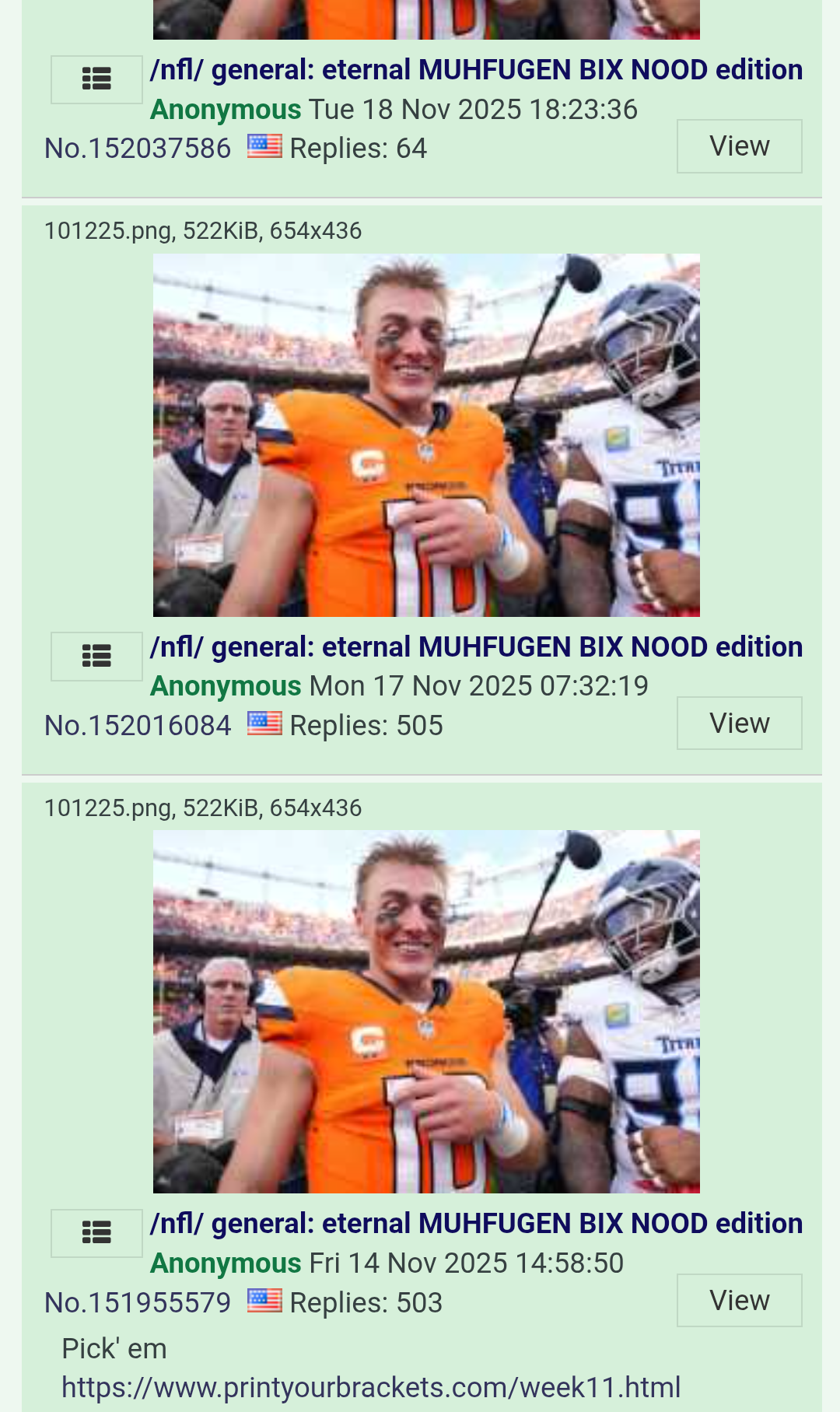 >>152209617The rams and broncos fags really help fill the void of the faggot mahommes stat spammer. I guess the pats/bears superbowl threads will be salt mines