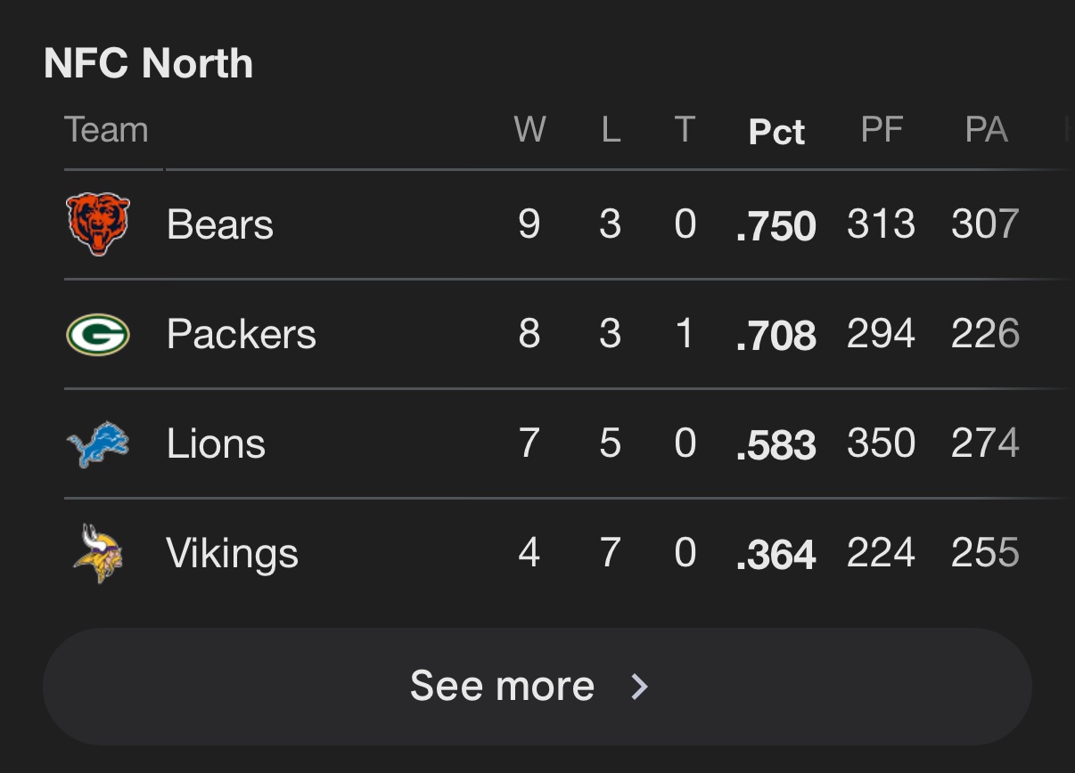 >>152215196>>152215251They’ve definitely caught some big breaks. They feel like the Commanders of last year with a worse qb and a better D. I could see them winning a playoff game, but unless Gayleb figures it out down the stretch they aren’t a contender imo