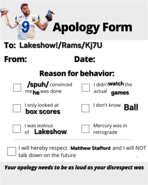 He has adamantly refused to own up to his mistakes formally for continued slanderous accusations against Leading MVP Candidate, top 10 All Time Passing Yards holding and Super Bowl Champion John Matthew Stafford.
