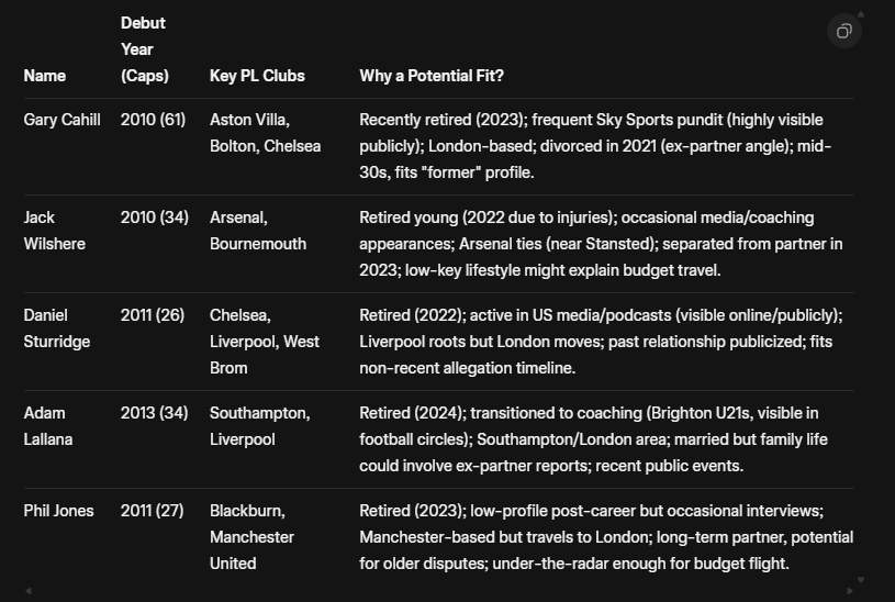 >>152269642There's a lot more than that. It doesn't say retired from football but reads like its not a current England player. Also don't know if its only from the 2010s or across decades.J-Lingz for example may be safe because he played for England as recently as 2021.
