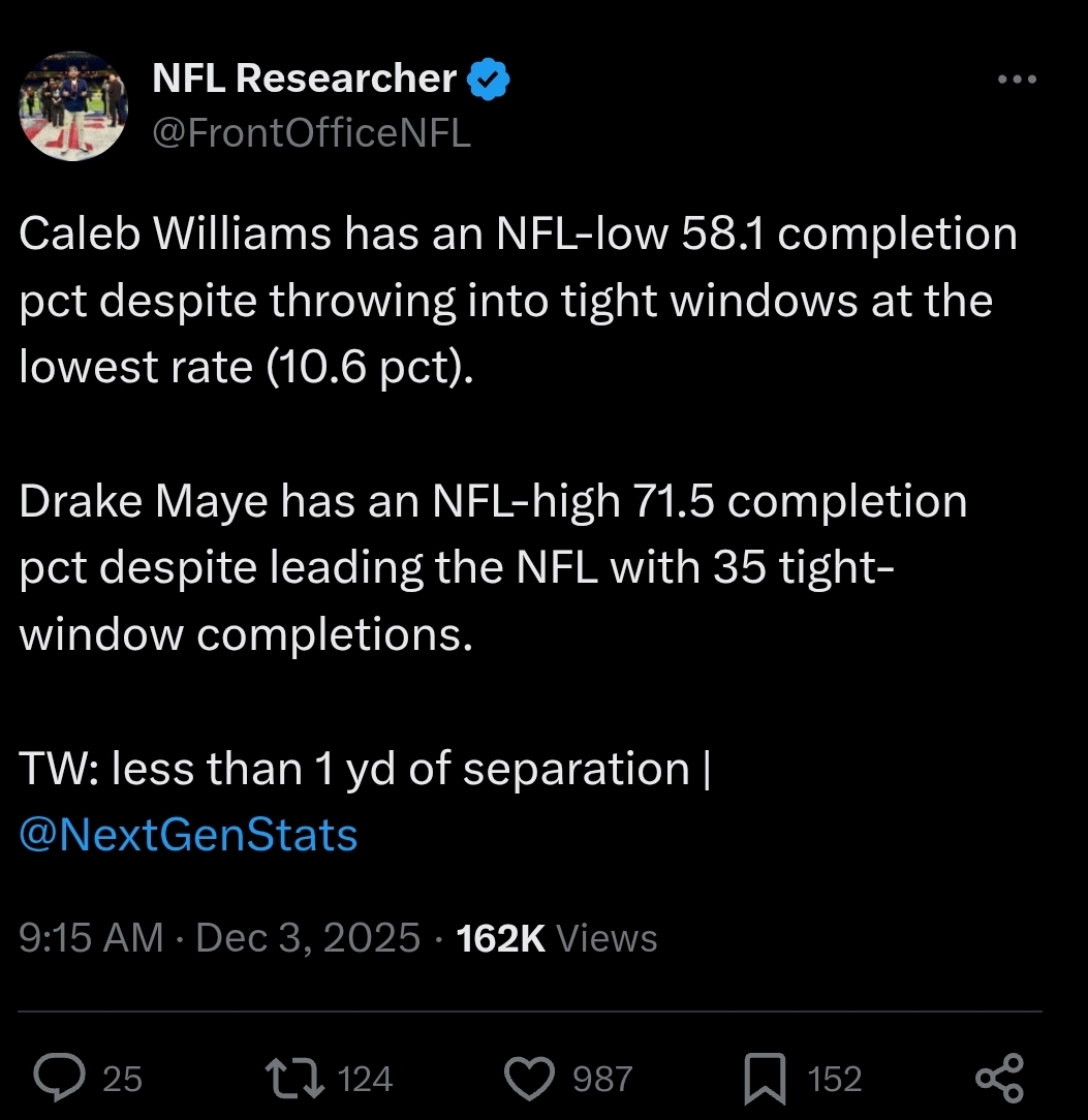 >Caleb Williams has 58% completion rateso is he not actually elite this season?