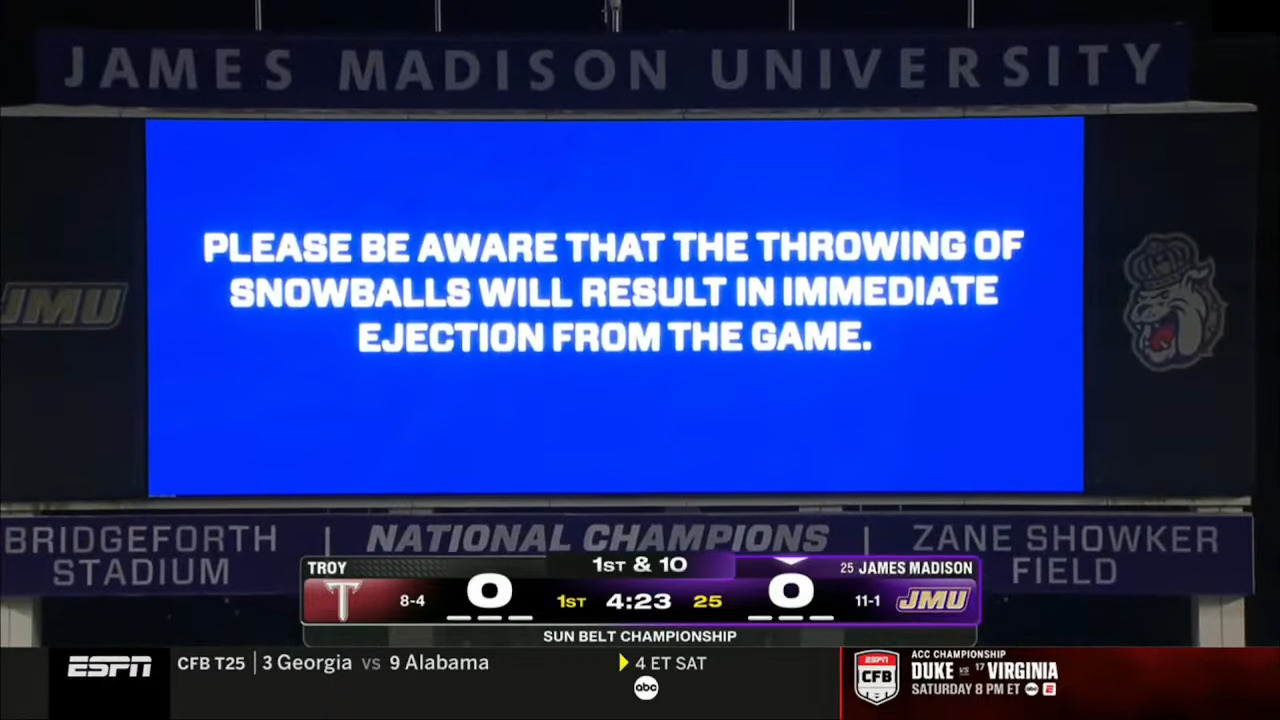 >>152410425Blame the ACC for having retarded tiebreakers that cucked their only playoff-worthy team in favor of a 7-5 shitter. That's why JMU is in. Wouldn't have happened if the ACC CCG was Miami vs Virginia. If conferences will be this large and they aren't going to use divisions they have to use CFP rankings as the second or third tiebreaker.