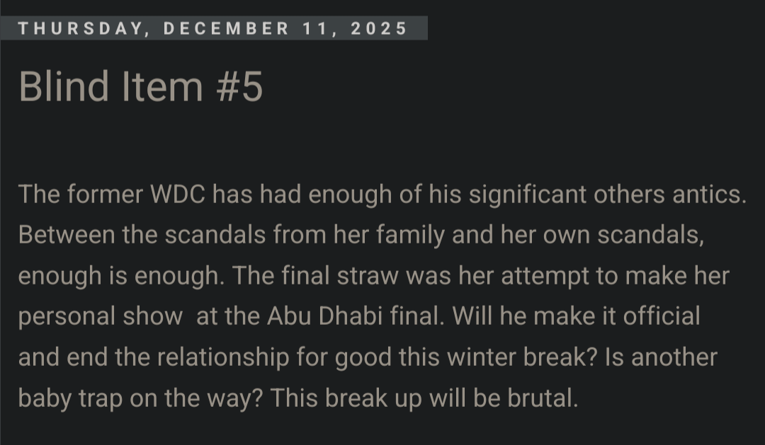 >Lap:#8290>Countdown to WINTER TESTING AND THE DEATH OF F1:https://f1exposure.com>Last lap:>>152433942>/f1/ Essentials:https://pastebin.com/tZ67Gcuq>24/7 stream of the F1 Reviews from 1990-2009 (and possibly more F1-related content in the future):https://angelthump.com/gimi>FantasyGP.com /f1/ League Formula Autism:Passcode: 12481641>Lewis Hamilton Grands Prix with Ferrari without scoring a podium:24>Haas F1 Team F1 Grands Prix without ever scoring a podium:215>Fernando Alonso F1 Grands Prix since last win:225 (224 starts)>2025 WDC Final Standings:NOR: 423VER: 421PIA: 410RUS: 319LEC: 242>2025 WCC Final Standings:McLaren Mercedes: 833Mercedes: 469Red Bull RBPT: 451Ferrari: 398Williams Mercedes: 137>2025 WEC Final StandingsHAM: 1,516NOR: 1,423TSU: 1,407>News:Testing 1 in 45 DaysNando impregnated Melissa Jiménez, baby will be born in MarchIn 2022 Olbear had fun on the the F1 Feeder Series 'Discord'Dr. Marko to leave Red Bull after 20 yearsCrawford sets the pace as F1 season concludes with Pirelli tire testLando Norris takes car number 1Max Verstappen set to retain Gianpiero Lambiase as race engineerSand Fort organizers tried to turn spectators gay without telling themAnother day, Magui Corceiro is still a slut (not news)