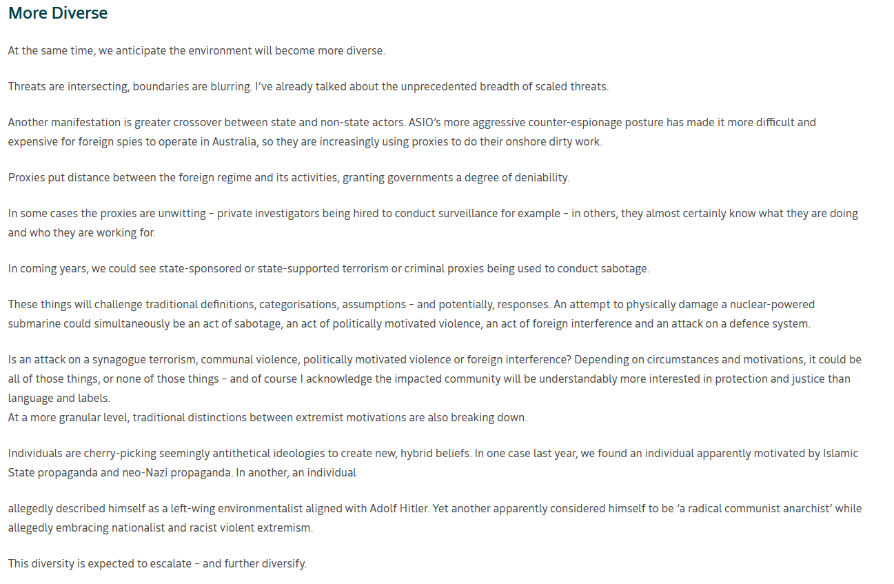 https://www.oni.gov.au/news/asio-annual-threat-assessment-2025>Individuals are cherry-picking seemingly antithetical ideologies to create new, hybrid beliefs. >In one case last year, we found an individual apparently motivated by Islamic State propaganda and neo-Nazi propaganda. >In another, an individual allegedly described himself as a left-wing environmentalist aligned with Adolf Hitler. >Yet another apparently considered himself to be ‘a radical communist anarchist’ while allegedly embracing nationalist and racist violent extremism.>This diversity is expected to escalate – and further diversify.