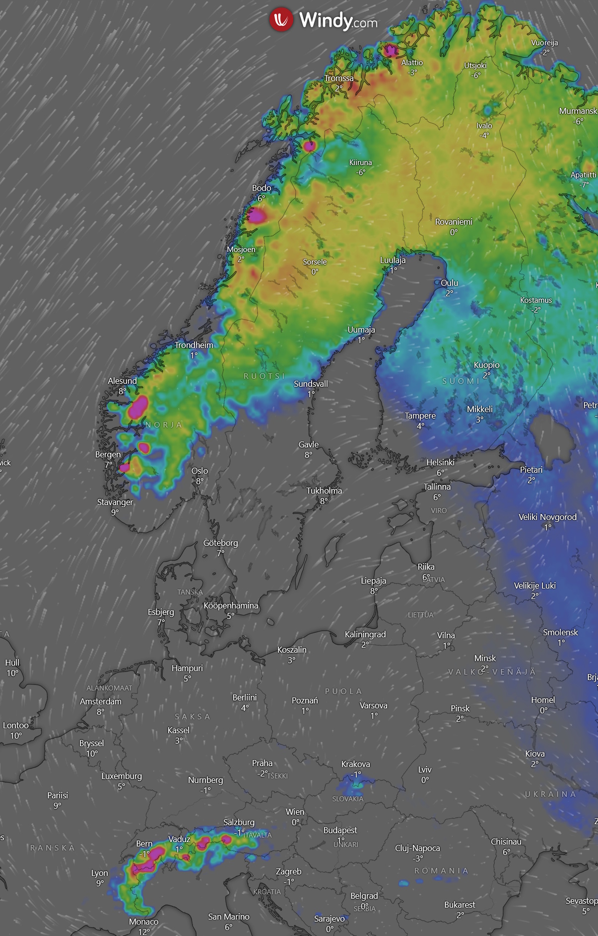 >>152517760Actual measurements from few stations. Educated guess based on rainfall and temperature. Satellite radar data. This pic is from Finnish Meteorological Institute, looks very similar.