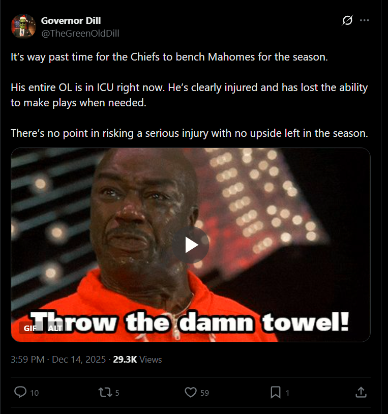 >Chiefs out>Mahomes out>Receiver dedGood game all around, a beautiful Sunday, God is good