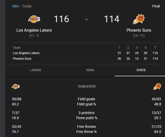 43 fts by the Lakers in order to win by one