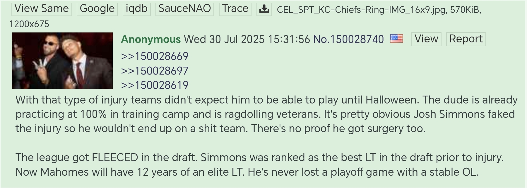 >>152509539Nah. Eagles hurt them in the Super Bowl but they could have gone on and on and recovered. The Chargers unironically brutally murdered and ended their dynasty forcibly. Mahomes isn't just out of the playoffs with that loss and officially eliminated; he's injured and might even be gone for a portion of next year and will likely never, ever get back on track again.Sorry, breh. Chargers ended the dynasty.