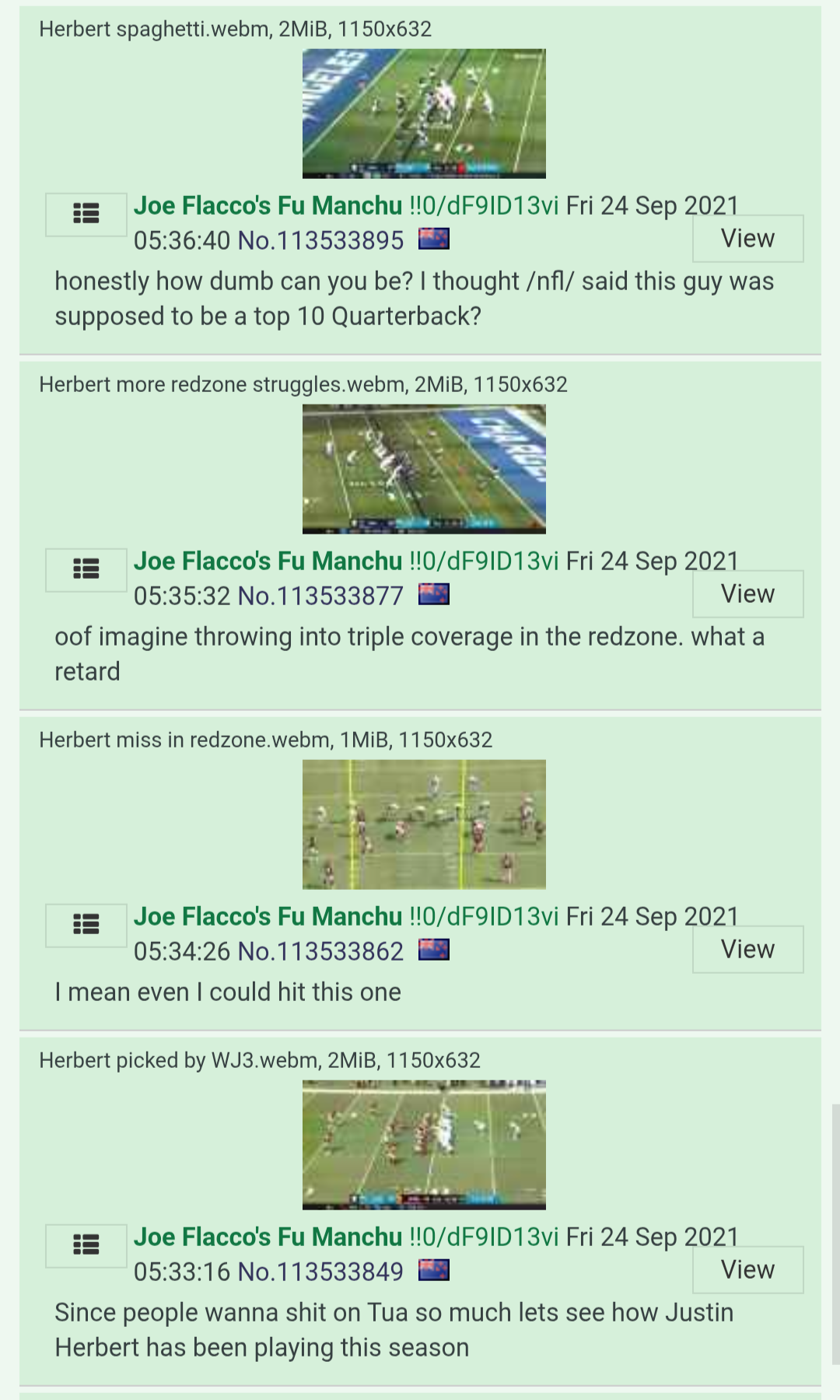 >>152509517Yes I would and then I'd show him this screenshot to prove I actually know what I'm talking about as a tape Chad. I was literally watching All 22 and posting cut ups in September/October 2021 of Herbert's struggles in the redzone. See pic related >>152509535Like the other guy see pic related. I've been right about Herbert for a long time. He's very talented but his struggles now are still the same struggles he had and I highlighted during his 2nd season. It's the same reason I was highler on Bo Nix than anyone on /sp/ pre draft 2024 because I watch tape before speaking on these guys