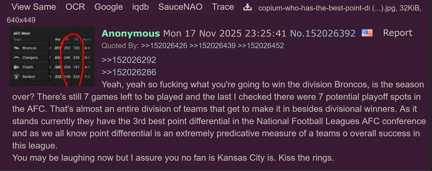 >>152518126chiefs-pats 'fans' are upset.