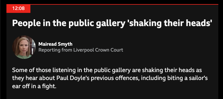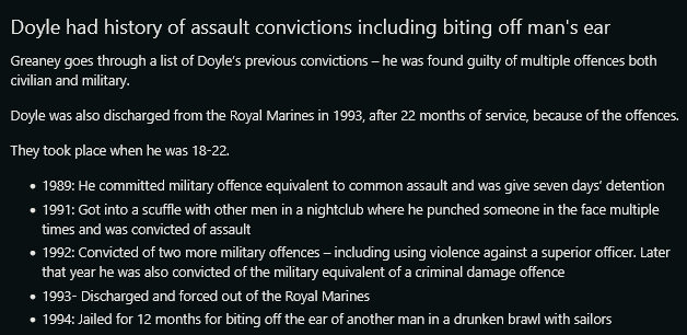 >On 3 November 1994, after his discharge and while serving for a short period in the Royal Marine Reserve, Doyle was again convicted of causing grievous bodily harm and jailed for 12 months at Preston Crown Court.>Greaney said: "The offences occurred on 2 July 1993 and involved the defendant biting off the ear of another man in a fight.>"When interviewed by the police in connection with the current offences, the defendant explained that he had become involved in a drunken fight with sailors."scousers out there biting sailors ears off