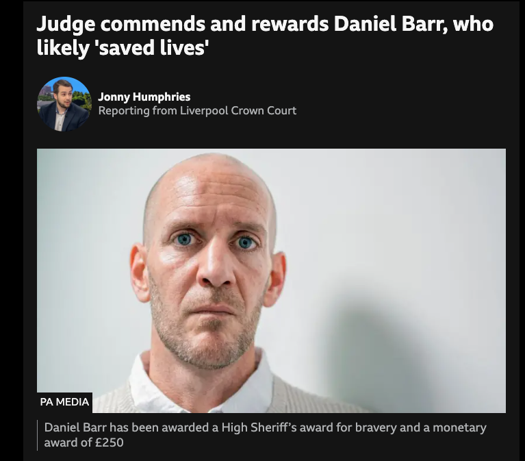 >"His car finally came to a stop because of the actions of one man - Daniel Barr. A man who can truly be described as a hero.>"Mr Barr got into the back of Paul Doyle’s car. He did not know what he was facing when he did but knew he had to stop him.>"The Crown Prosecution Service would like to thank Mr Barr for what he did on that day.>"His conduct merits public recognition, I therefore make a High Sheriff’s award for bravery and a monetary award of £250."new richest man north of watford?