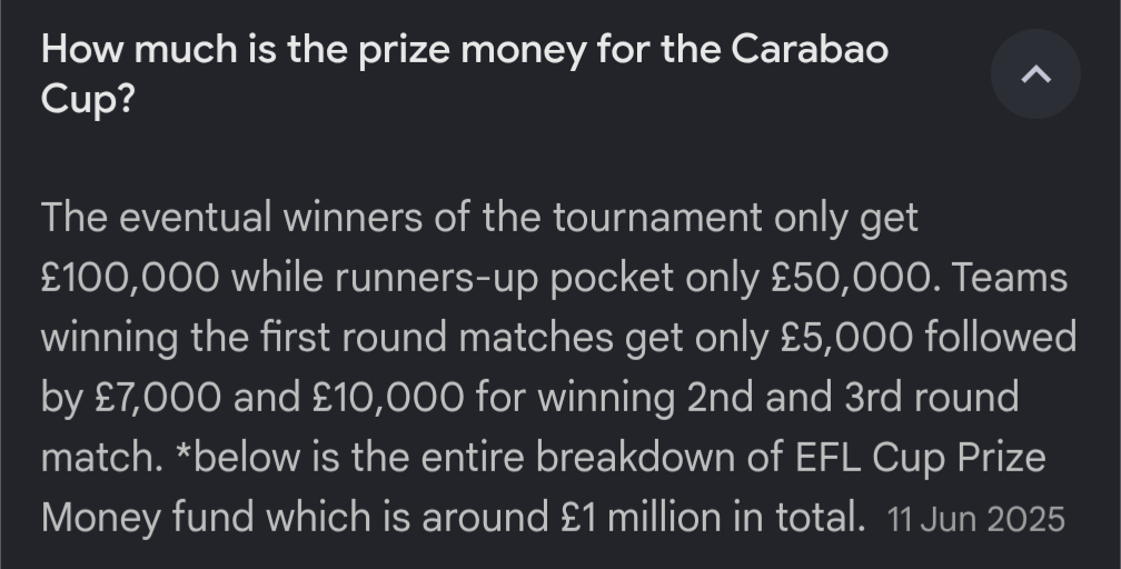 >>152536355The prize money is genuinely hilarious by footballing standards.A win for Liverpool, for example, would pay Virgin Van Dick's wages for two days (not including bonuses)