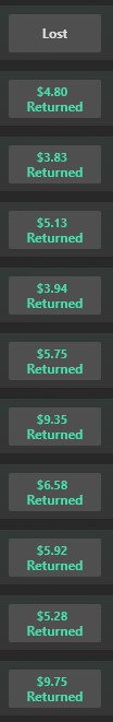 So that's 5/5 bets won with this strategy. Values of the bets range from 1.6 to 1.9.