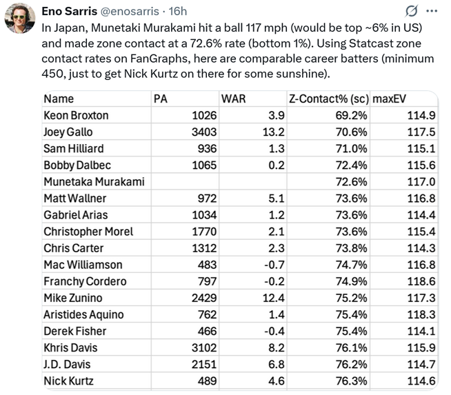 >>152543973>Oh yeah because having the guy whose health is a huge question mark is so greatJapanese Kyle Schwarber>Alek fucking Manoah as our fifth starter is just going to be perfect.Perry said he has to earn it and will start in the Bullpen (like Sasaki kwab)>Soriano>Detmersthey just hired Mike Maddux. One of the best pitching coach in MLB>Murakami strike out mythHis strikeout rate in NPB is around the same as ruinedbaseballtani's was in NPB