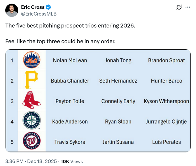 https://x.com/DanBartels2/status/2001678031157604717With the markets for Alex Bregman and Cody Bellinger likely moving out of the Mets’ comfort zone, pivoting to the Japanese market for offense, Munetaka Murakami and/or Kazuma Okamoto, may be in the Mets’ best interest.https://x.com/WexlerRules/status/2001672657658593363Per @Ken_Rosenthal like @mets, @Dodgers are interested in OF Lars Nootbaar #Metshttps://x.com/metsnewsletter/status/2001686300554932688The Mets "gladly will spend" on a top-tier starting pitcher, provided the years are short, according to Jeff Passanhttps://x.com/wow1814819/status/2001462223483605030I AM SO FUCKING READY TO POST THIS WITH THE SIGNING THAT IS INCOMINGIt is not a name that you’re gonna expect, but you’re really gonna like it.We are cooking something special and I think those meetings have gone fantastically. The reporters don’t realize it, but we have a very elaborate plan.https://x.com/DanBartels2/status/2001682031919411387The Mets are among the teams that have been the most aggressive in the mid-tier starting pitching pursuit, per @JeffPassan. Some pitchers of that tier: Chris Bassitt, Lucas Giolito, Nick Martinez, Zack Littell, Max Scherzer, Justin Verlander, Tyler Mahle, German Marquez, Walker Buehler, Patrick Corbin, Michael Lorenzen