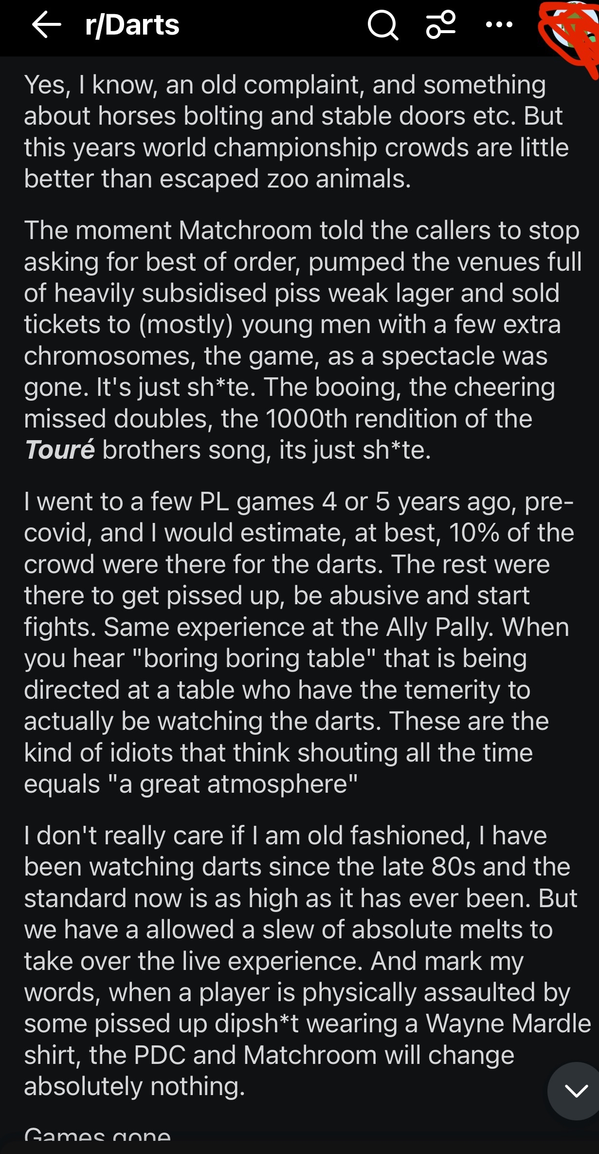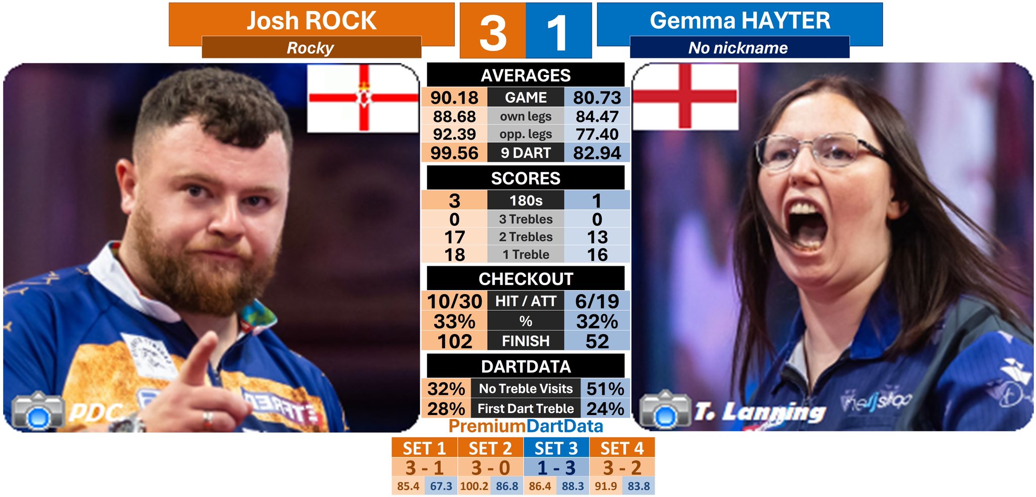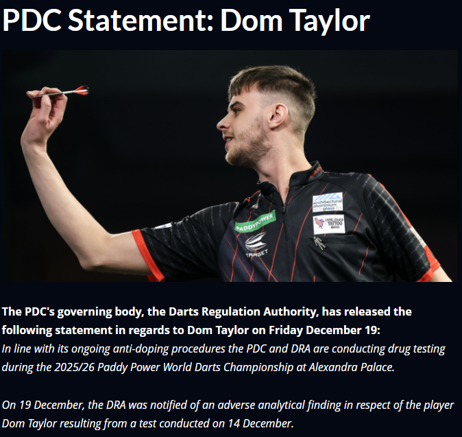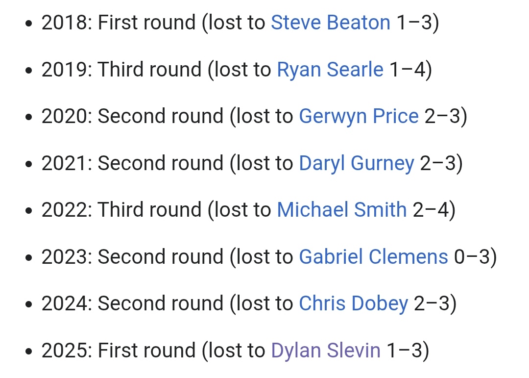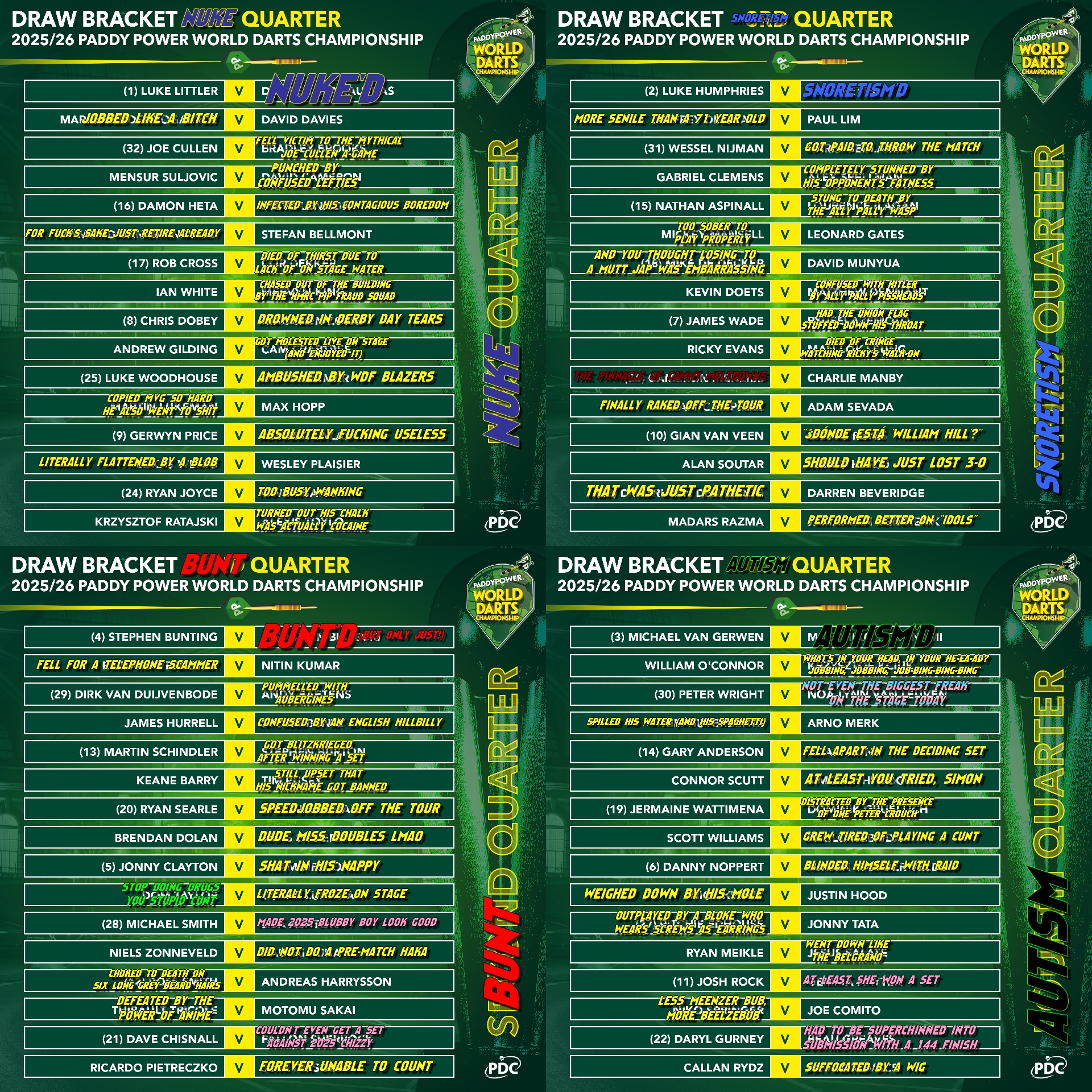 And so that was Day 9 and the conclusion of the First Round. The only upset of the day came in the afternoon's penultimate encounter as Leonard Gates struggled his way to a deciding set victory over an equally terrible Mickey Mansell. The game' tight first set went the way of Soulger, with the Clonoe Cyclone whitewashing Set 2 and Gates coming back with a 3-1 Set 3. The match then collapsed as a remarkable 33 dart break for Mansell was followed by a 21 dart hold and he threw it out for a level game. That was as good as it got for the Ireland-loving Ulsterman as he just stopped playing and got whitewashed in the deciding set.Speaking of Ulstermen, their Unionist players were both tested by females but progressed through to Round 2. Josh Rock was the first to compete in the afternoon's final match, and having blown Gemma Hayter away in the first two sets (despite being pretty poor in the opener) 3-0 looked to be a formality. However, Rocky's level dropped back down and Hayter amazingly managed to claim the set 3-1 before forcing Rock to throw out the fourth set. Daryl Gurney on the other hand required colossal finishing to remove Beau Greaves. Superchin broke to win the opener 3-2 before Beau hit 128 and then a 10 darter to level. Gurney survived a 102 attempt to take Set 3 with Greaves whitewashing Set 4. A vital last dart D10 in the decider from Daryl was followed by a monumental 144 out and he scraped through 3-1. Credit to Beau, she will be a danger next year.Elsewhere, Nathan Aspinall hit 170 to get rid of Lourence Ilagan, William O'Connor hit a tournament high 102 average to demolish Krzysztof Kciuk, Kevin Doets got through in 4 sets and cloggers Ryan Meikle and Keane Barry both won in straight sets.Tomorrow sees the Last 64 begin, and it will be the Bunt quarter with its 15 players competing. The reason for 15? A certain Dom Taylor has managed to again get himself banned for failing a drugs test, sending Jonny Clayton through. What a fucking imbecile.