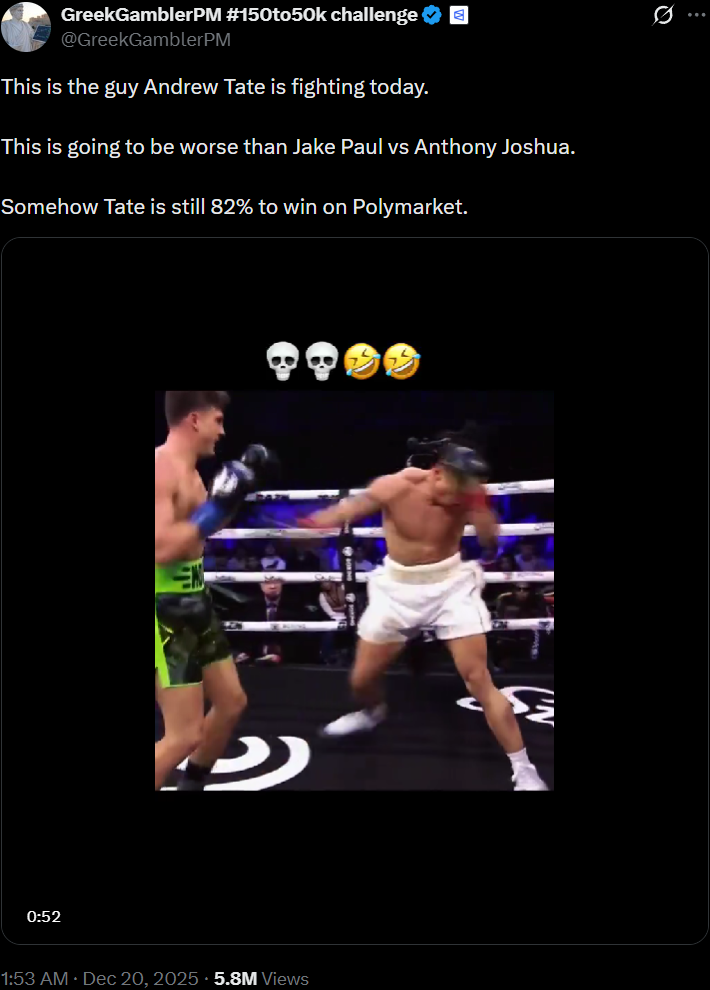 >>152592828https://x.com/GreekGamblerPM/status/2002316385859293556People who thought Tate's opponent was any good clearly doesn't know who he was. It was a cherry pick gone wrong. This dude does not know how to fight. He doesn't know how to throw a punch, or how to enter a boxing stance.Look at this DOOD!